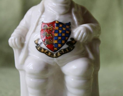 T.S. Duncomb, Greaves & Co, and Dolby Brothers all who traded on High Street, the Stamford Supply Company, and Starsmore & Co. to name another two are just a few of the shops in Stamford before and after the First World War that sold crested china in Stamford. From small pots and vases to aeroplanes, submarines and zeppelins, crested china came in all sorts of shapes. The most local shape to Stamford is of course Daniel Lambert who died on June 21st 1809 in the Wagon and Horses Inn in St. Martins. His gravestone in St. Martin’s New Churchyard records his weight as Fifty-Two Stones and Eleven Pounds.